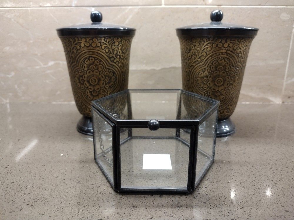 This is a NEW beautiful set of jars and a glass box that are a great set for your bath or vanity to store those much needed supplies like cotton balls, qtips and make up accessories. Or place them on your desk area to keep your everyday supplies within reach and at the same time your work area remains tidy. Includes: * Two (2) metal jars featured in an antique gold and chocolate brown finish with intricate etchings throughout it's body. Each one measures approximately 6" tall x 4" diameter * Octagon glass box with a dark gray metal frame. It measures approximately 4.5" wide x 4" deep x 2.5" tall. All are in NEW condition with no stains, chips, cracks or damages. Located on the west side. Please click on my name to see other items I've posted
