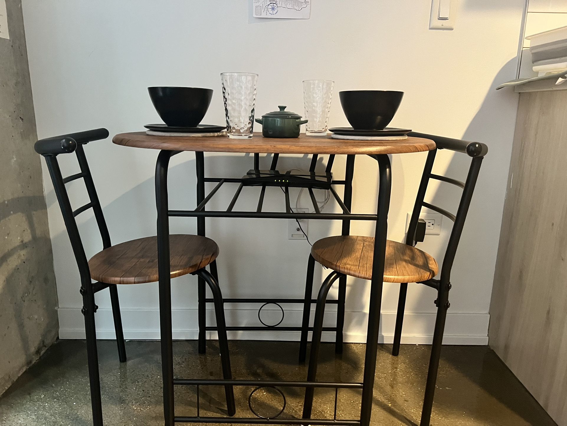 Small dining table for two can also function as a desk. A little wobbly, but works perfectly.