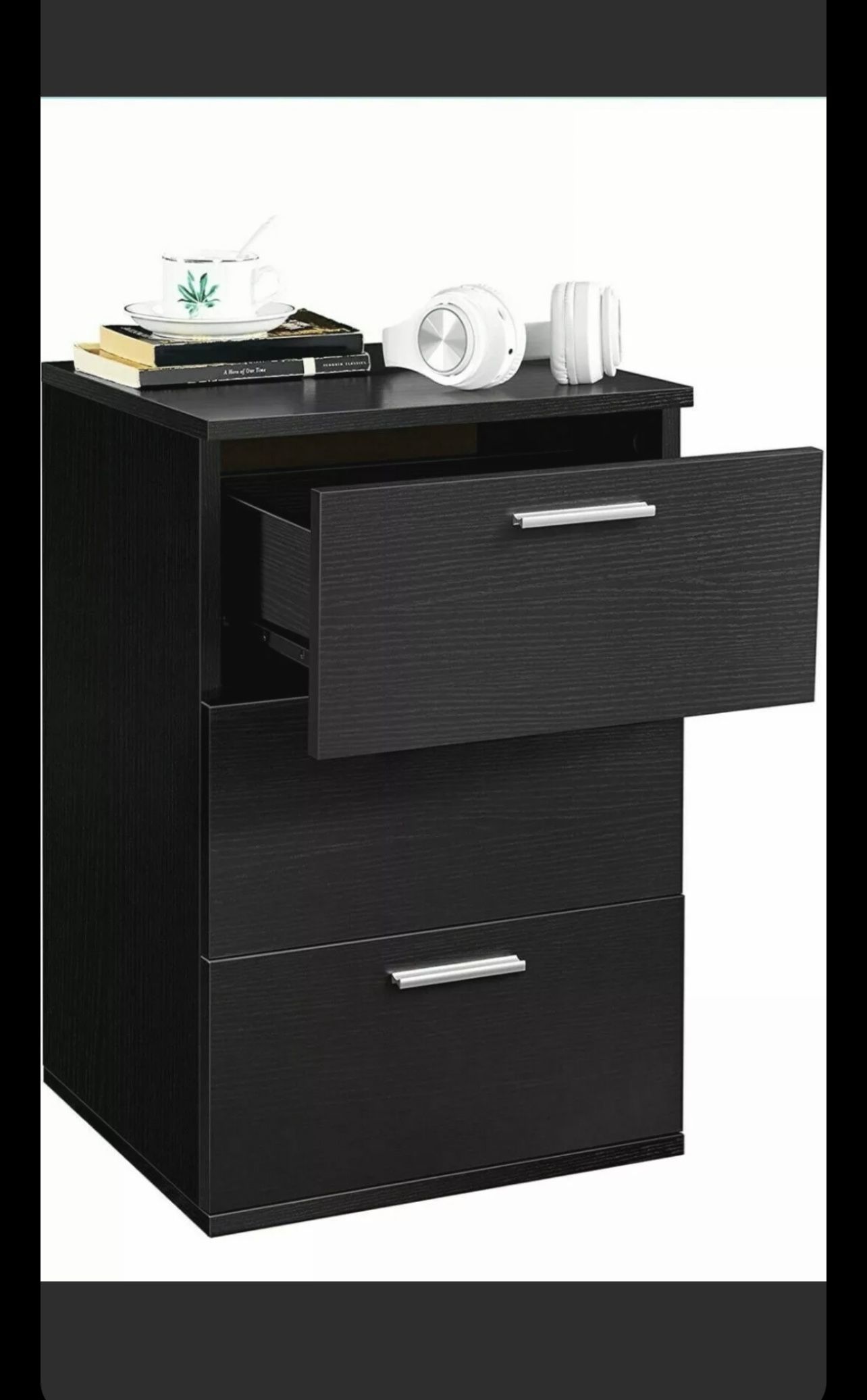 New in box, never opened. Black end table with drawers. Can be used as a small dresser or side table with storage.