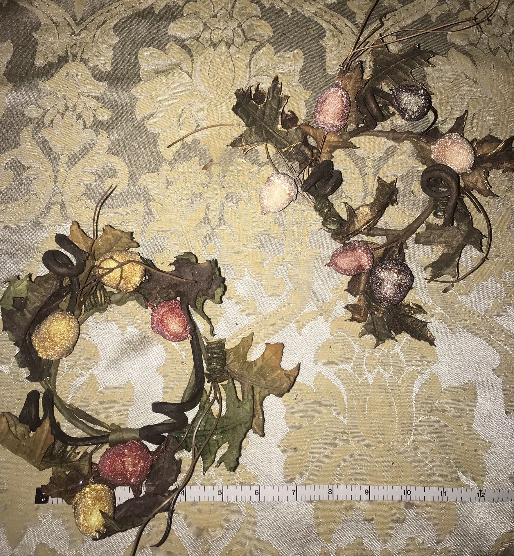 Rich browns and turning leaves with glistening via glitter adorn this 4-5” candle ring. Candy beaded nuts and acorns. 7 available. Perfect for tables or mantles with a candle or battery operated candle placed in center. The ring is paper wrapped to look like real branch and grapevines spring from it. Vintage from the 90’s and kept safe. Would be great for Easter or rustic Christmas, aside from fall decor.