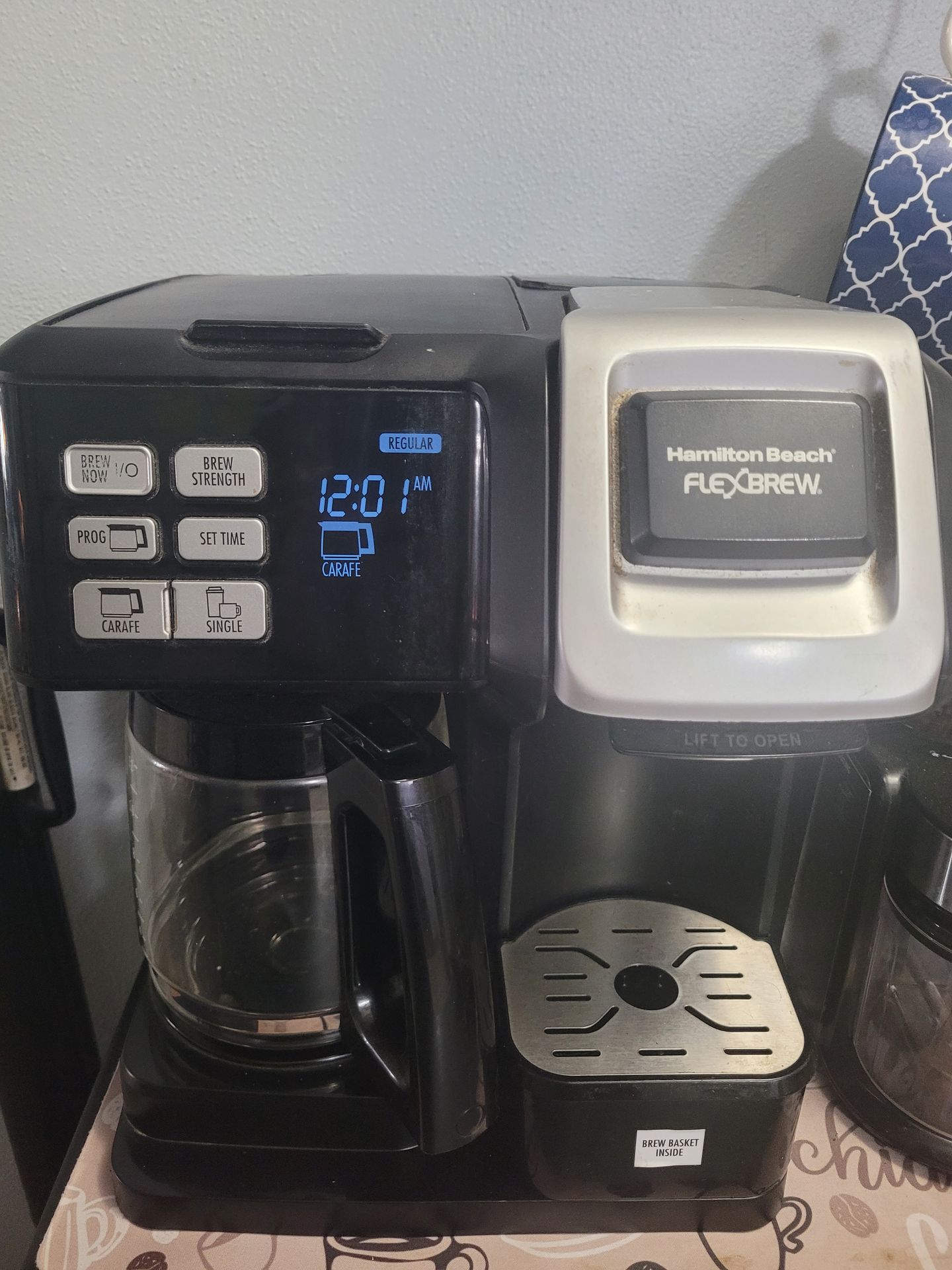 Hamilton Beach Flex Brew. Single cup maker or full pot. Used with pods for single. For full pot use filter. Works great
