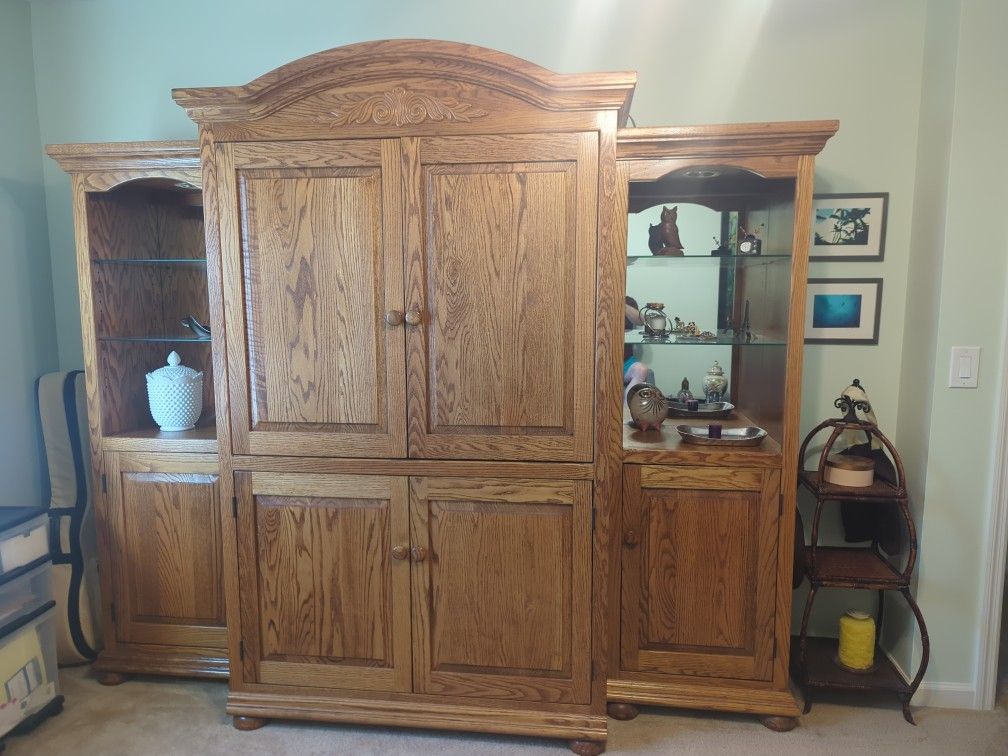 This is real solid oak furniture. Not veneer. Powered with lights above glass shelves. Lots of storage. Purchase does not include moving. TV optional. Other contents not included. If you buy it I will help you disassemble it and load it. $100 or best offer.