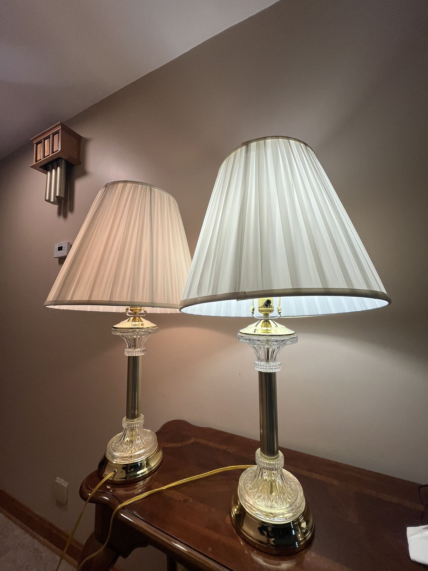 Pair Of Column Style Gold Tone metal And clear Glass Lamps. 29.5 in tall. The 2 shades are in decent condition. Good overall condition. The lamp shades are the same color but appear different because of the bulbs. They are identical. Scroll through my listings and reviews!