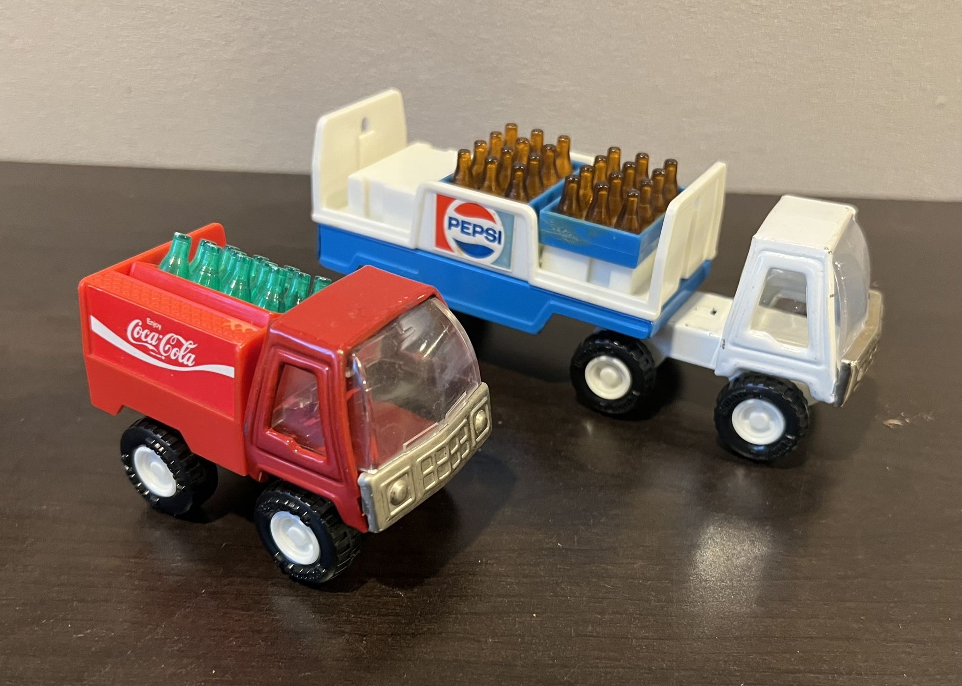 Vintage Buddy L 1979 Pepsi Semi Delivery Truck with two cases of bottle and a Coca-Cola Delivery Truck with bottles. Both in nice overall played with condition!