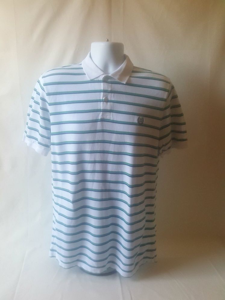 Chaps by Ralph Lauren men's green striped polo shirt size M.Laid flat the length is 29"the width from pit to pit is 20"and the sleeve length is 9".Pre-owned and in excellent condition from a clean and smoke-free environment.Thank you for viewing this item. B35 33 16