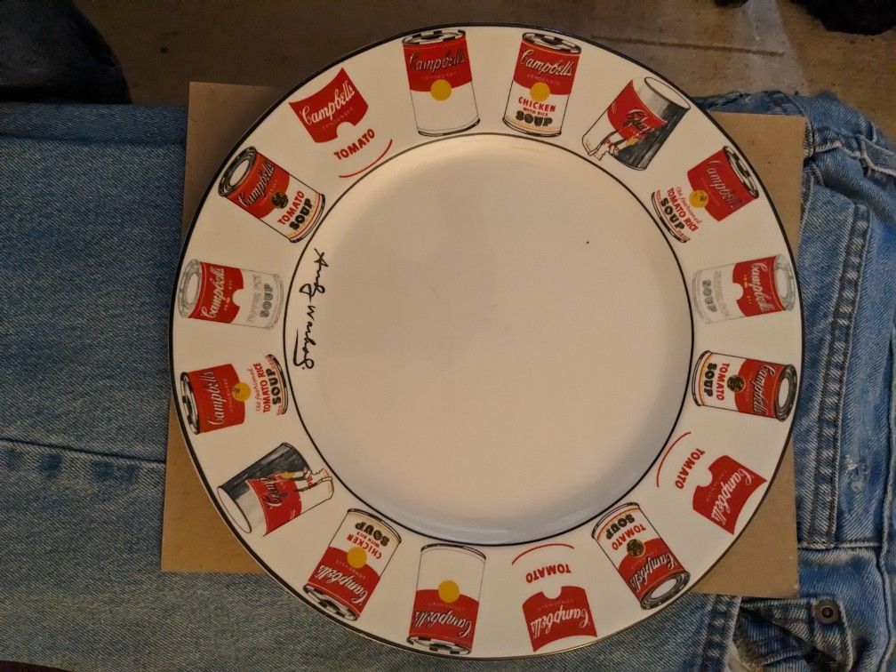 (3) Andy Warhol Soup Bowls9" Block Art Peeling Campbell Soup Can Label And (1) I Andy Warhol Campbell Tomato Soup Can 10.75" Dinner Plate POP BLOCK