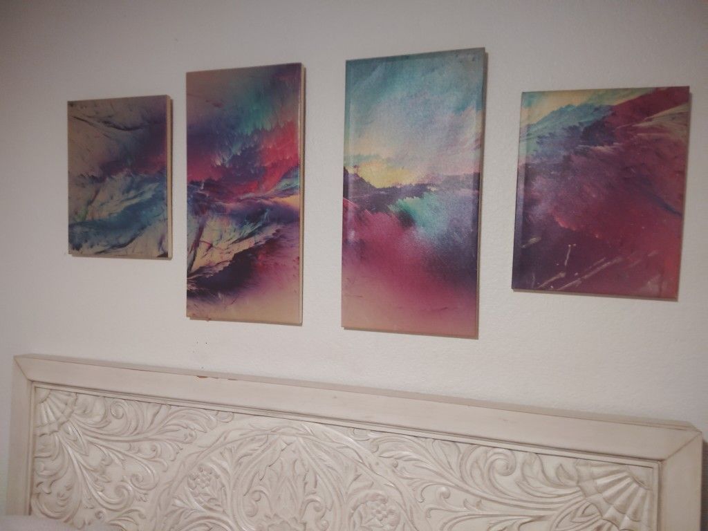 Set of 4 prints, bright colors, abstract. Middle two are 2 feet long for size reference