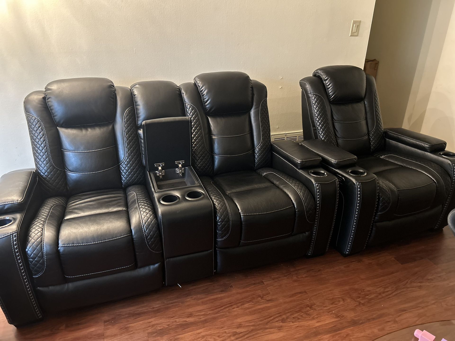 3 piece leather black reclining set has LED lights come with charger ports/ usb ports on all couches & storage . Smoke free and willing to negotiate price only 1 1/2 year old sale price $3000