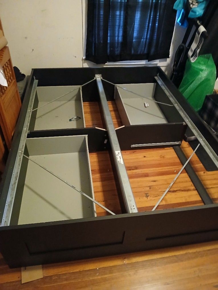Good Condition Black in color 4 large compacity drawers includes slats like new mattress and box spring. Pick up in Concord