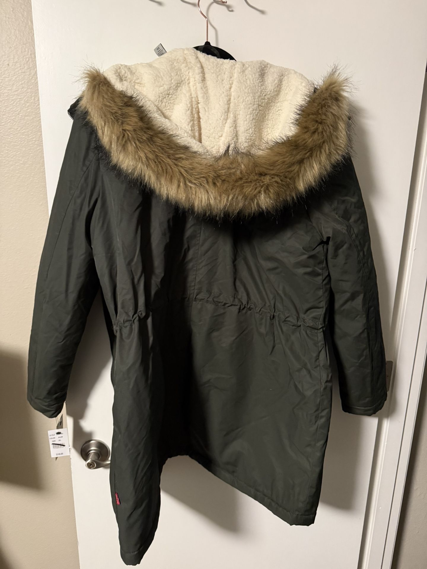 Embrace the cold with this stylish olive green parka, featuring a luxurious faux fur trim. Ideal for adding warmth and elegance to your winter wardrobe.