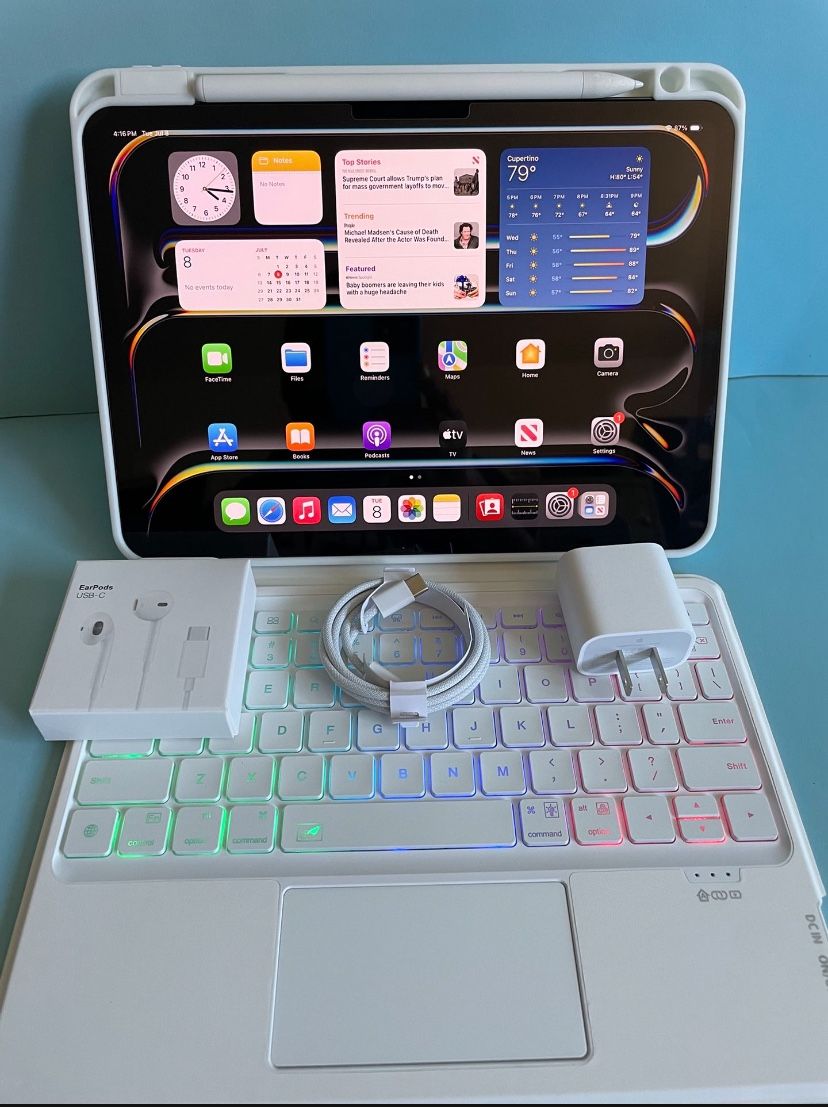 Newest 2025 Model iPad Pro 11β (M5/ Latest model) Like new condition *small dent on corner 100 % battery π heath / Cycle 1 WiFi only Model Face ID (unlock by face) 4 speakers (great sound) M4 Fastest chip (fast processor) 4K video recording (2 HD cameras) Siri, Facetime, GPS, calendar, app store, etc. pre installed. Long Battery life ( Latest iOS 18 updated) * Apple limited warranty till October 2026. Good for gifts (birthday/christmas) school work, business work, home work, entertainment etc. Comes with New Apple charging cable New Apple fast charging adapter New wired earphone (not apple) New magnetic stylus pen (Ailun brand) New Bluetooth keyboard case (lights up) with Touch / track pad feature Tempered glass screen protector installed $899 firm No less Cash only (No trade) Serious buyer with immediate pick up only No holding first come first serve Low ballers will be ignored Pick up only El Monte Apple IPad Pro 11β (M5 chip / 2025 Newest ) 256GB with keyboard, pen & Accessories (Warranty + )
