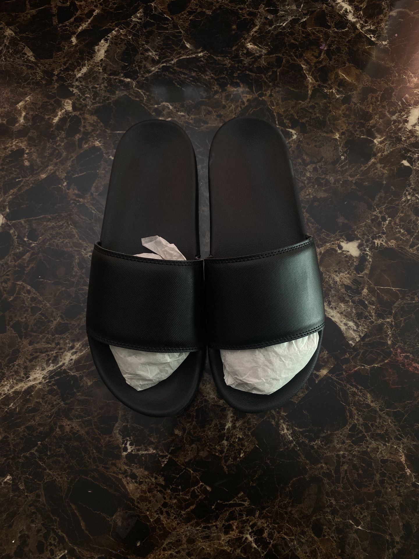 Brand new black slide sandals – size M 11/12. ✔️ Comfortable and lightweight ✔️ Great for casual wear, lounging, or the beach ✔️ Clean minimalist design ✔️ Never worn No original box, but will be shipped securely. ✅ Fast shipping ✅ From a smoke-free home