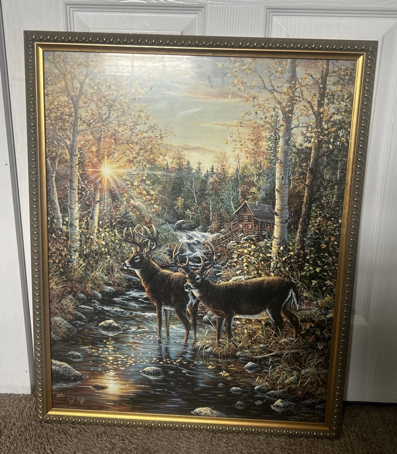 Large Framed Deer Forest Landscape Oil Painting on Canvas, Realism Art