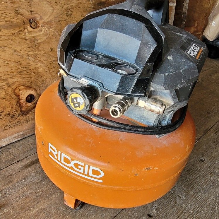 USED works great Ridgid 6 Gal. Portable Electric Pancake Air Compressor • 150 PSI Max with two Universal Push-to-Connect Couplers • Includes: Power Cord RIDGID introduces the 6 Gal. Electric Pancake Air Compressor. This powerful compressor is perfect for trim and finish work with 150 PSI. Work with multiple people on the job site with dual universal quick connectors and use 2 nailers at once. Equipped with a best-in-class oil-free pump for reliable, maintenance-free performance, this compressor has everything you need to get the job done. 19