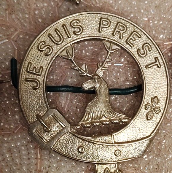 original Post 1922 The Lovat Scouts white metal cap badge. The badge is a strap inscribed "Je Suis Prest". In the center is a stag's head. The loop fittings on the back are intact. 4.6 X 5.4 cm. Very good condition. Loop fittings intact. Local pickup