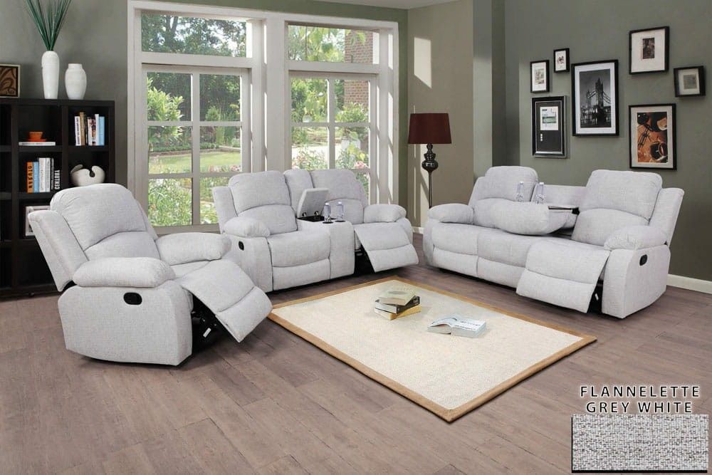 Brand New Light Gray Linen Fabric 3pc Reclining Set With Storage Compartments A Drop Down Table & Built In Cup Holders