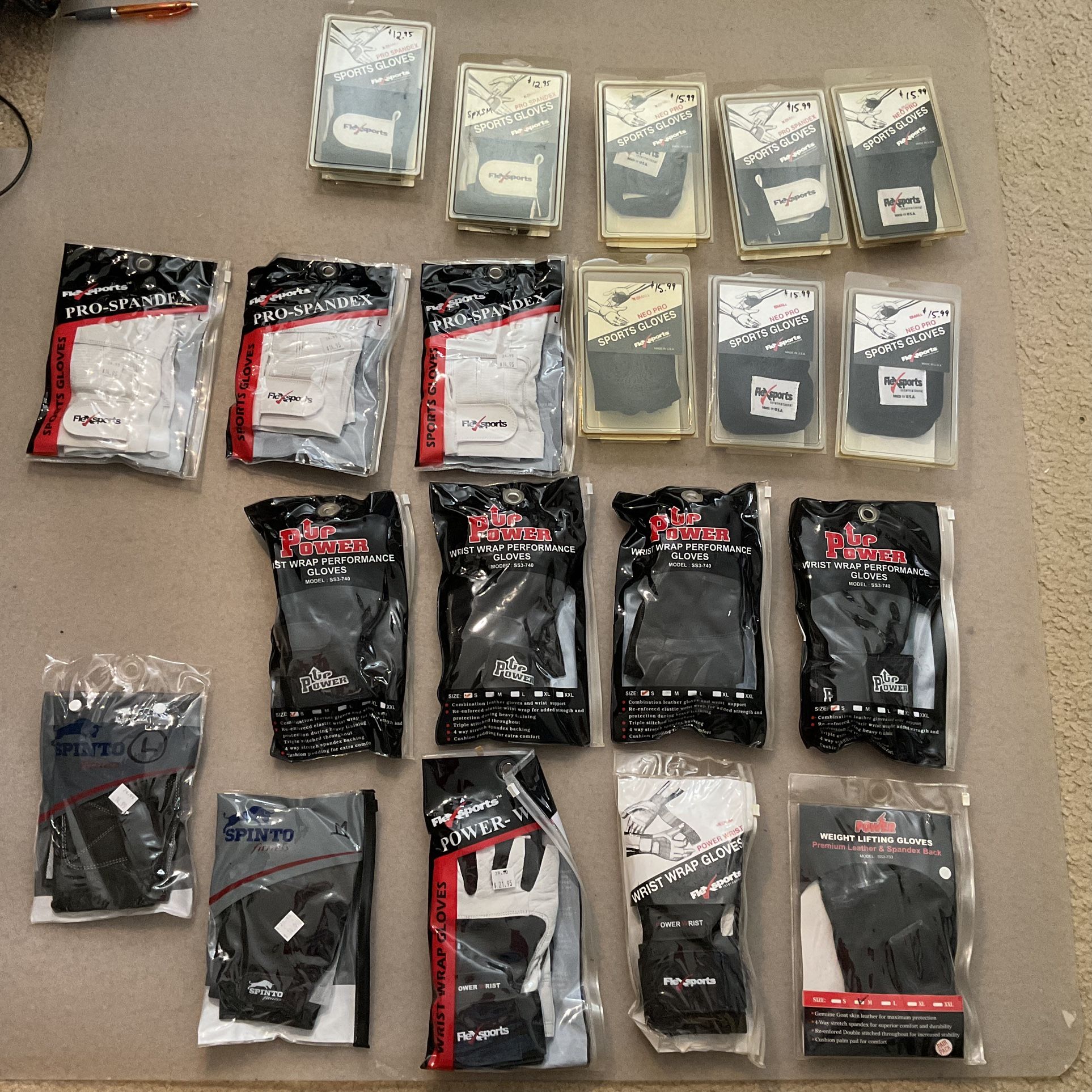 New excellent lot ,of sports gloves ,,gym,weights Workout ,,etc,,,8 each 8each Xsmall,small. Medium ,,and large Ships fast Pick up west melbourne