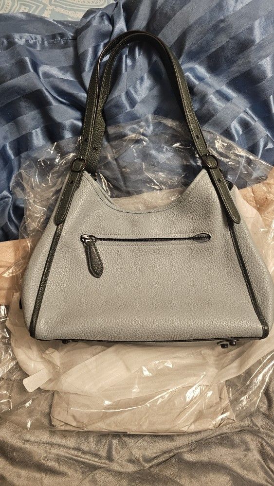 Like new - still have the packaging and price tag from when I purchased. Light blue pebble leather with dark green leather trim & gunmetal hardware. Used for one week and has been sitting in my closet. I paid $495 but would entertain $300 or best offer. This is a rare color combo and no longer being produced. If you know and love Coach, this is too good to pass up. I'm a single mom, laid off & need money for my son's summer tutoring sessions. Serious inquiries only.