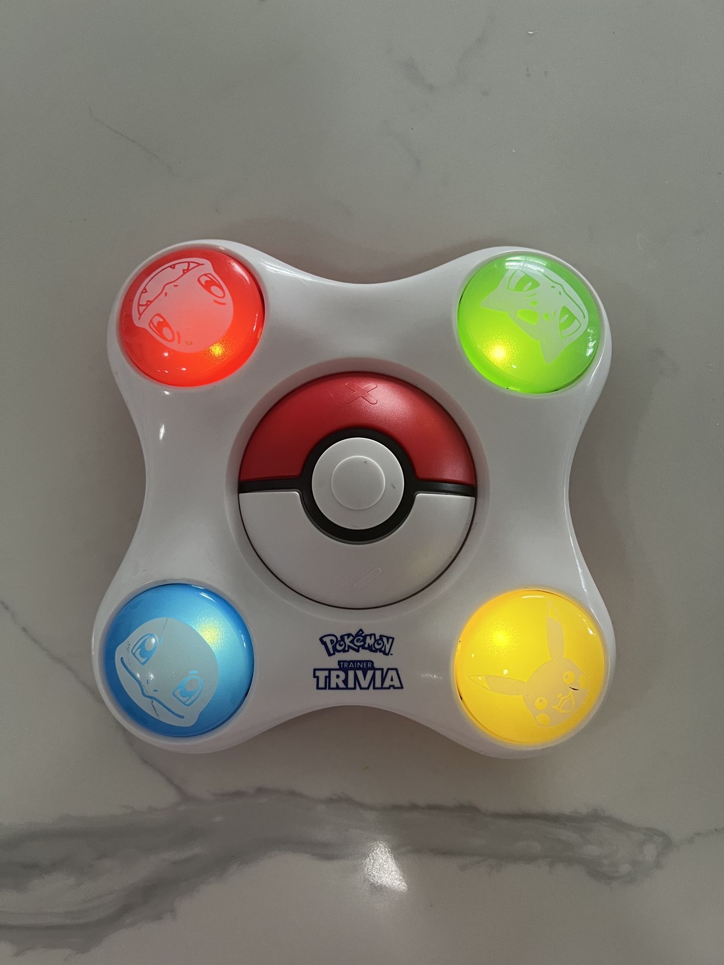Pokemon Trainer Trivia electronic game. Interactive trivia toy with lights and sound. Buttons feature popular Pokemon characters like Pikachu, Bulbasaur, Squirtle, and Charmander. Condition: Pre-owned and tested. Lights work as shown in the photos. Fun game for Pokemon fans or kids who enjoy trivia games.