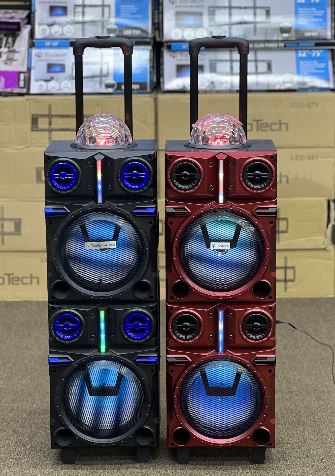 - USB/TF card input, FM radio - Double 8’’ speakers - Disco ball on top - Bluetooth wireless connection - Aux input - Build-in rechargeable battery - DC 9V input - Wired mic input jack with guitar input - Handle and wheels for portability - Wired microphone and remote included