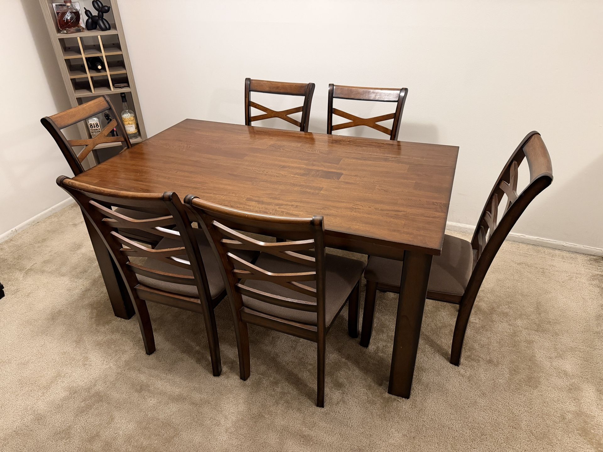 Wood dining table and 6 wood chairs with upholstered seats. Table is 36” W x 60” L x 30” H. Legs on table can be removed for pickup. Cash only.