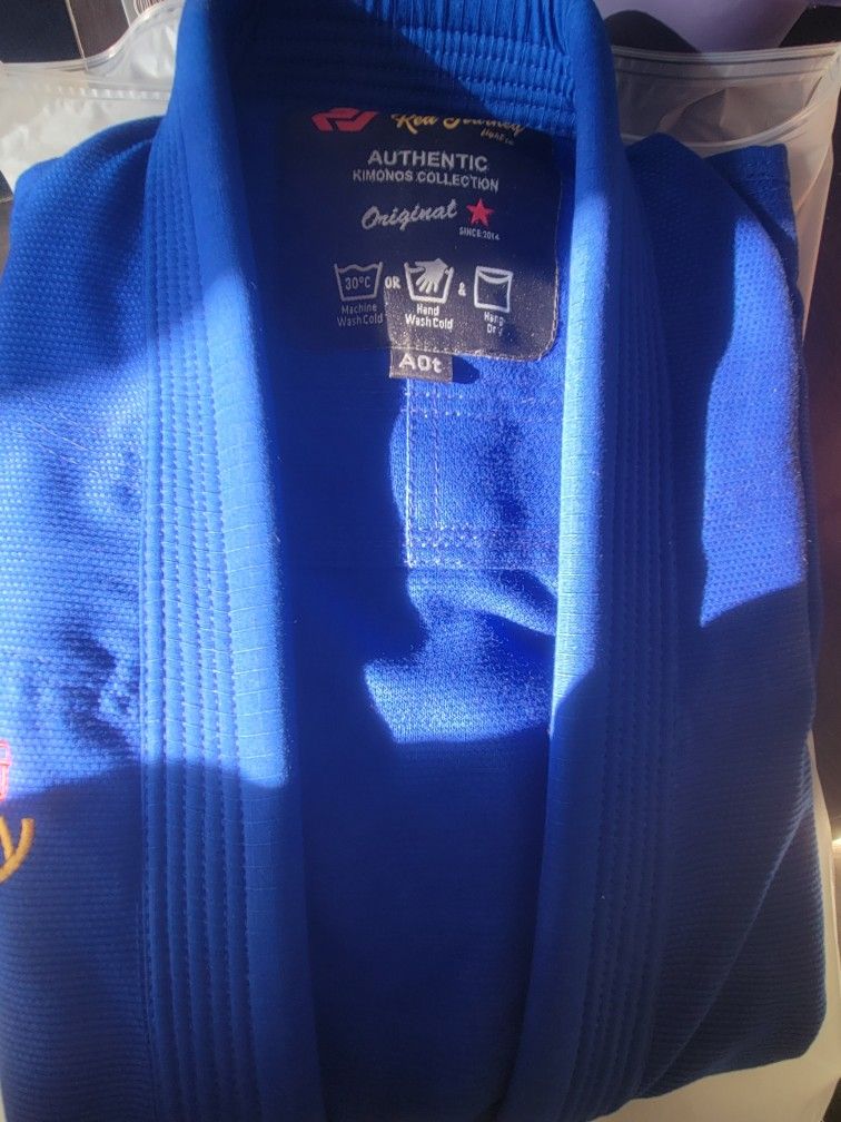 Brand new, still in bag Red Journey Jiu-Jitsu Gi A0t (thin | fitted) 5′ – 5’4″ 100 – 120 Weight 4 lbs Meets New 2024 IBJJF Competition Kimono Ruleset 380 GSM Pearl Weave Jacket 9 oz Rip-Stop Pants All Stress Areas Triple Stitched Solid Blue All Cuffs Reinforced Within IBJJF Specifications IBJJF Approved