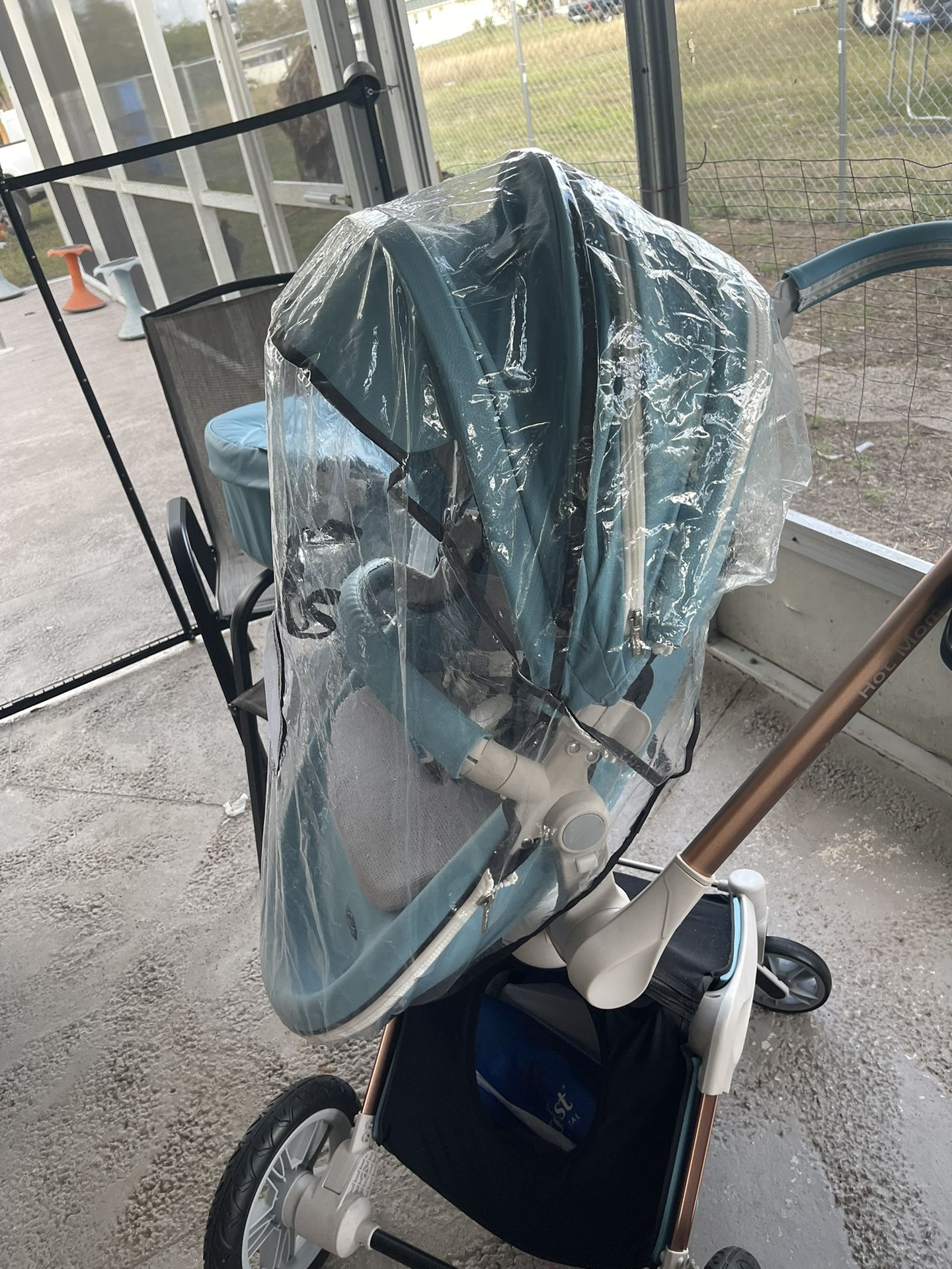 Tiene poco uso por lo q esta casi nuevo tiene bassinet y capa para la lluvia también gira y tieylos adaptadores para el carseat me costó $550 acepto ofertas