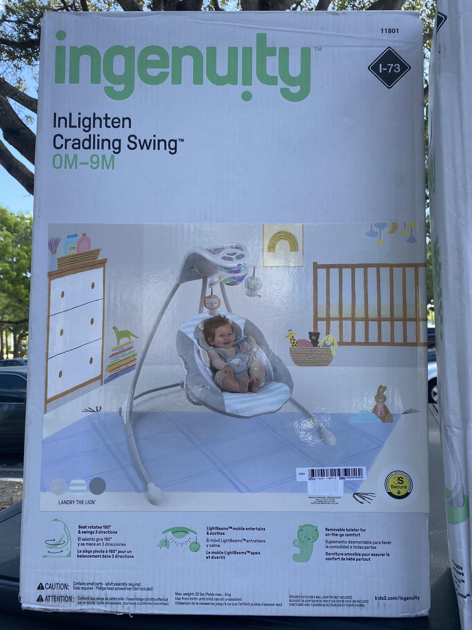 The Ingenuity InLighten Soothing Swing rotates 180° & swings in 3 directions LightBeams mobile includes 2 plush toys & projects a dazzling light show; mirror on the underside of the mobile encourages self-discovery. Easy to clean with machine washable seat pad & bolster pillow; frame & toys wipe clean Soothe baby with 16 melodies, 3 nature sounds & white noise; ConnectMe feature connects to your smart device & plays personalized music, videos, photos & more; includes 3 timer settings: 30, 45 or 60 minutes TrueSpeed Technology maintains 6 speeds as baby grows; includes 2 recline positions for baby’s comfort & 5-point safety harness; powered by a USB cord to save on batteries (included) - wall adapter NOT included Frame folds easily for portability & storage; great for travel, smaller homes or to keep at grandparents’ house; assembled dimensions 35.7 x 34.3 x 41.1"; For ages 0-9 months or up to 20 lbs BRAND NEW $100 each