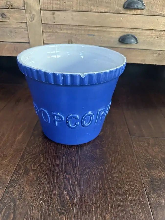 Sturdy, well made ceramic popcorn bowl. Perfect for movie nights or entertaining guests. Approximately 8" tall and 9" wide at the top.