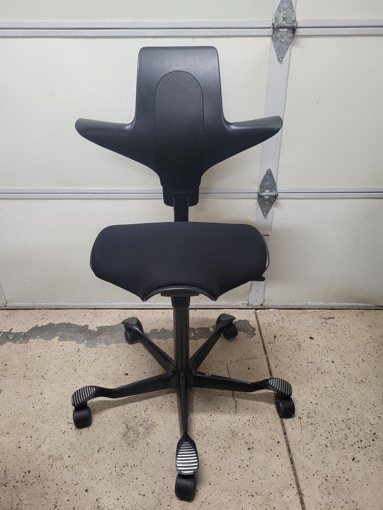 HAG Capisco Puls Adjustable Sit to Stand Desk Chair - Black Frame - Black Full Cushion. This is a RARE find - HAG Capisco Office chairs. In EXCELLENT shape. Sells on Amazon for $900 with taxes. We are selling them for $400 each out the door. Come get yours before they are gone! Pick up in San Diego CA 92128 neighborhood. We have 3 available. Can be used for a regular desk or an adjustable standing desk. - Seat Height is adjustable between - 19” to 26” – suitable for all work surfaces of 28” or higher. Features - • Soft and wide saddle seat promotes healthy blood flow and encourages movement to sit forwards, backwards or sideways • T-Shape 18.5" backrest • Backrest height adjustment • Seat depth adjuster • Seat height from floor 19” to 26” • Tilt adjustment lever • Tilt tension control • 360° Swivel • Black 27” five-star base • Dual casters for Hardwood and Carpet • Made from 50% recycled material and is 90% recyclable • Max weight capacity of 300 lbs Office chair, computer chair, desk chair, task chair, ergonomic chair, table chair, student chair, home chair, swivel chair, rolling chair, executive chair, gaming chair, conference chair, work chair, lumbar chair, mesh chair, work from home chair, home office chair