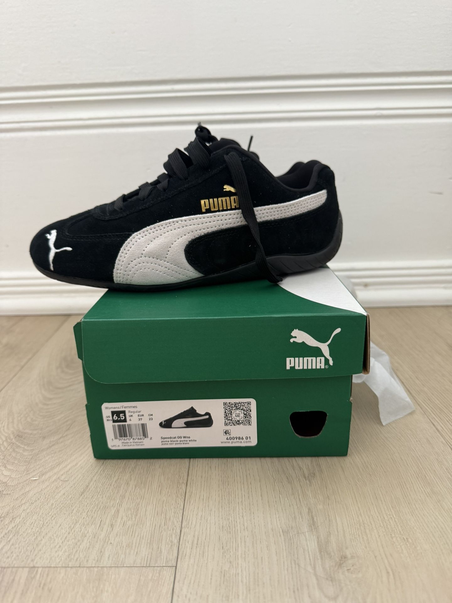 Brand new Black puma speedcats in size 6.5 for women with box. This was a gift and while this is my usual size they do not fit. Willing to do a trade for a size 7 in women’s or just a sale. Pick up is in east la near cal state LA.
