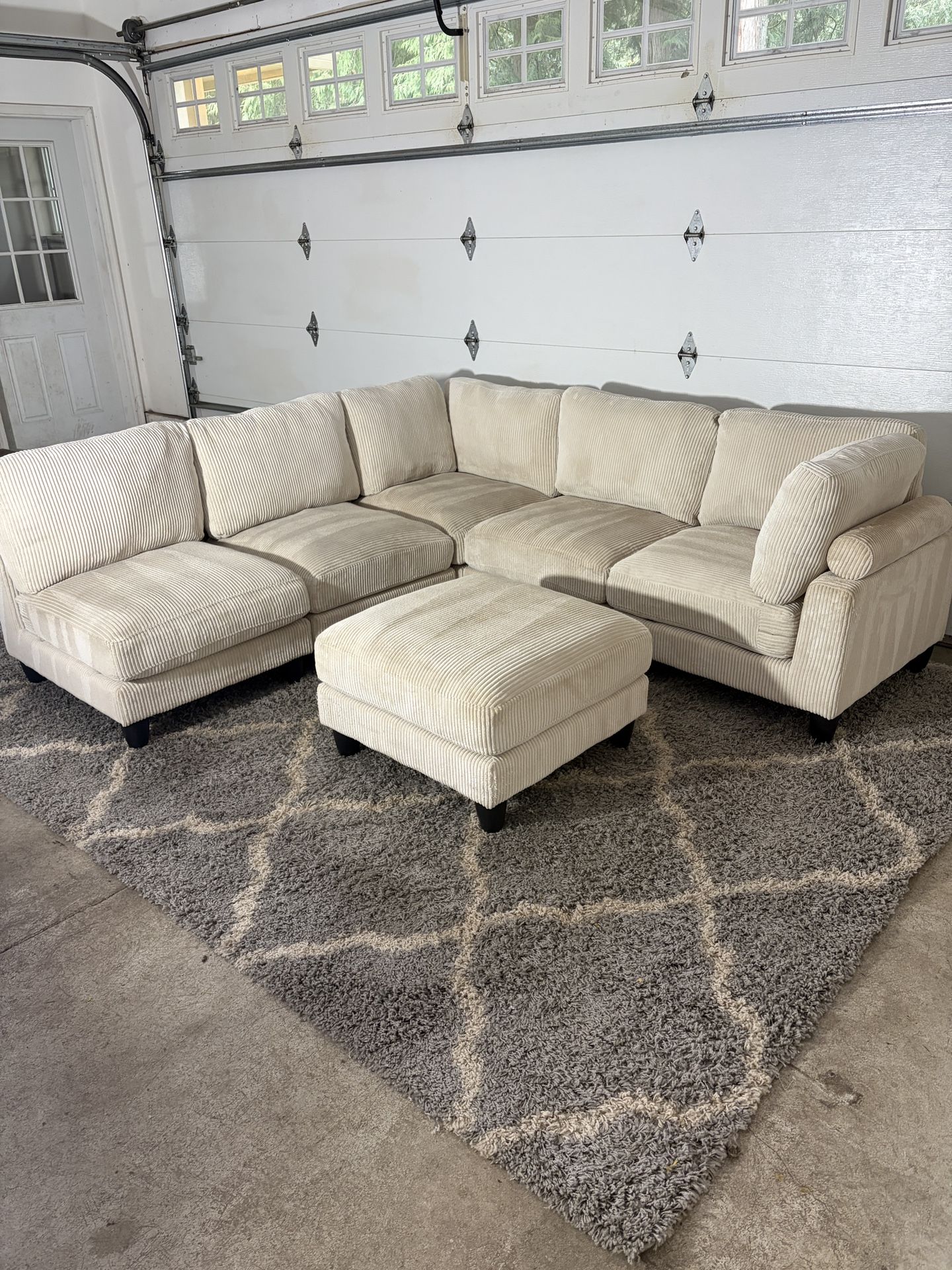 Beautiful cream corduroy modular sectional couch in great condition. Very comfortable with a modern look and soft textured fabric that fits well in any living room. This is a modular set, so the pieces can be rearranged into different layouts to fit your space. Includes matching ottoman that can be used as a footrest or extra seating. Dimensions:94” x 94” in current setup(Can be arranged in multiple configurations) Came from pet friendly home, but has been shampooed and all the covers are washable Clean, sturdy, and ready for a new home. Message me if interested. Pick up or delivery available