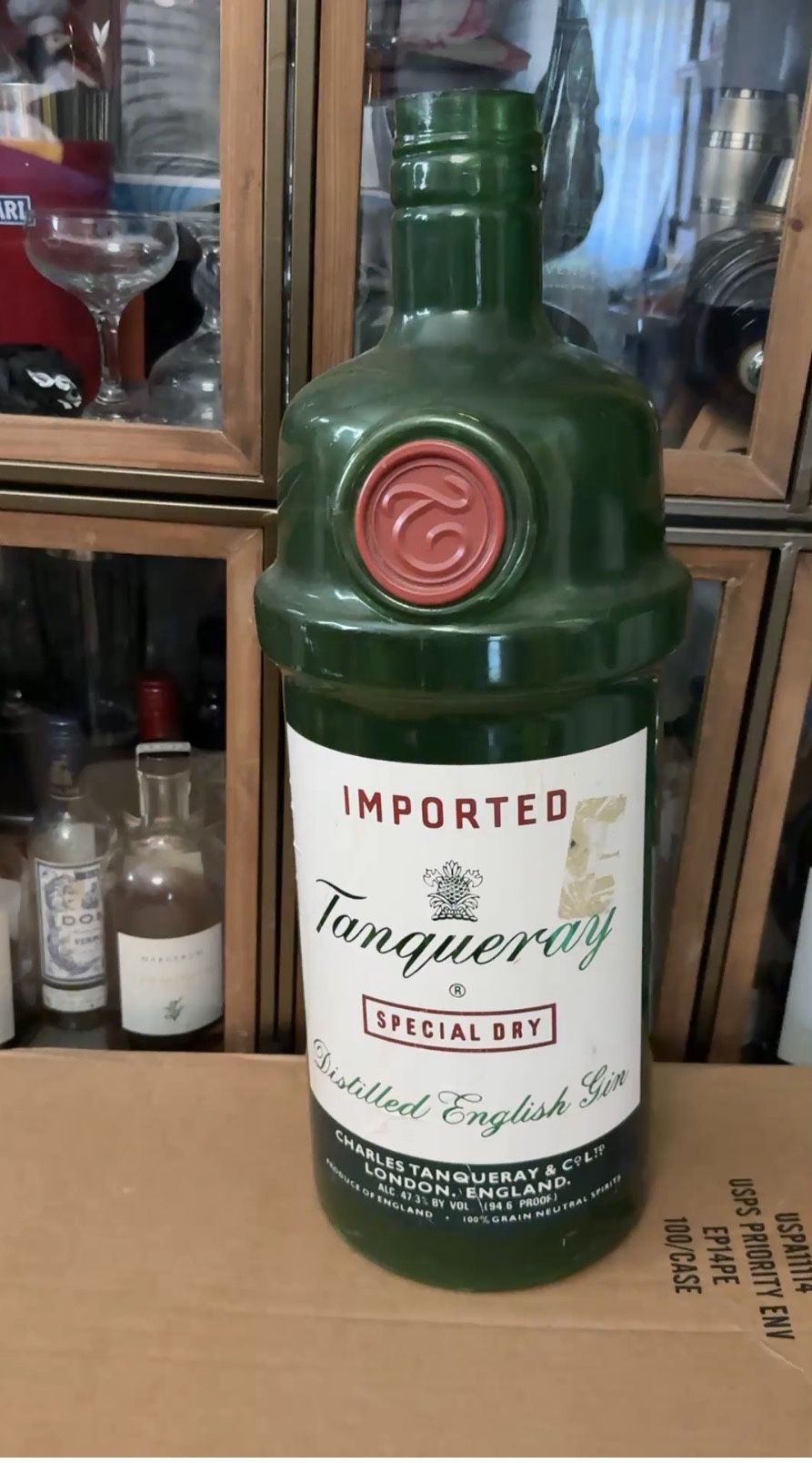 60’s Vintage Rare Tanqueray giant coin bank. See photo with gallon jug of water for size reference. Sticker residue on front label which I had intended to remove with GooGone! but never bothered to do it. The bottle is just fine as it is and wouldn’t be difficult to clean. I searched long and wide to find this one; you won’t likely find another.
