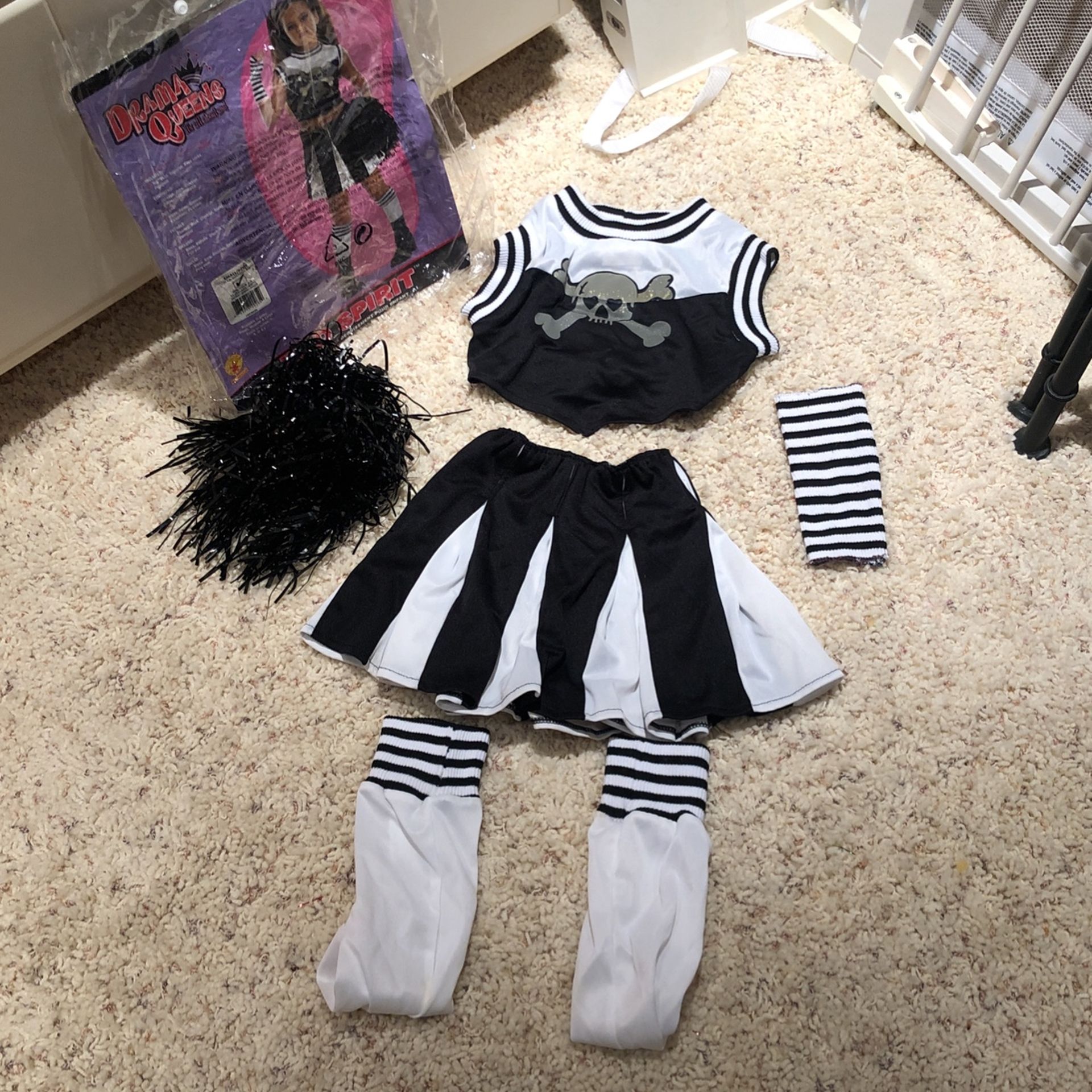 The packaging says size small (4-6) and then for 3-4 years. It runs small. Two piece. Crop top, skirt, leg covers (not socks), arm band, and pom pom.