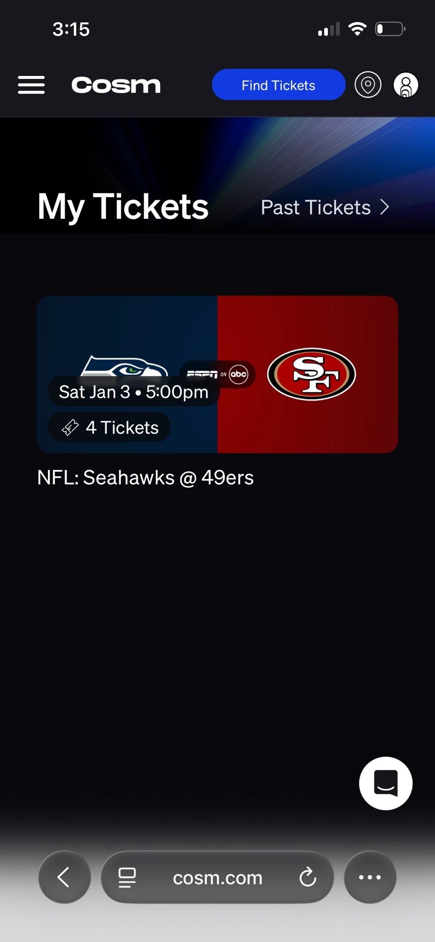 Cosm 49ers vs Seattle $100each 4 tickets will meet up to transfer