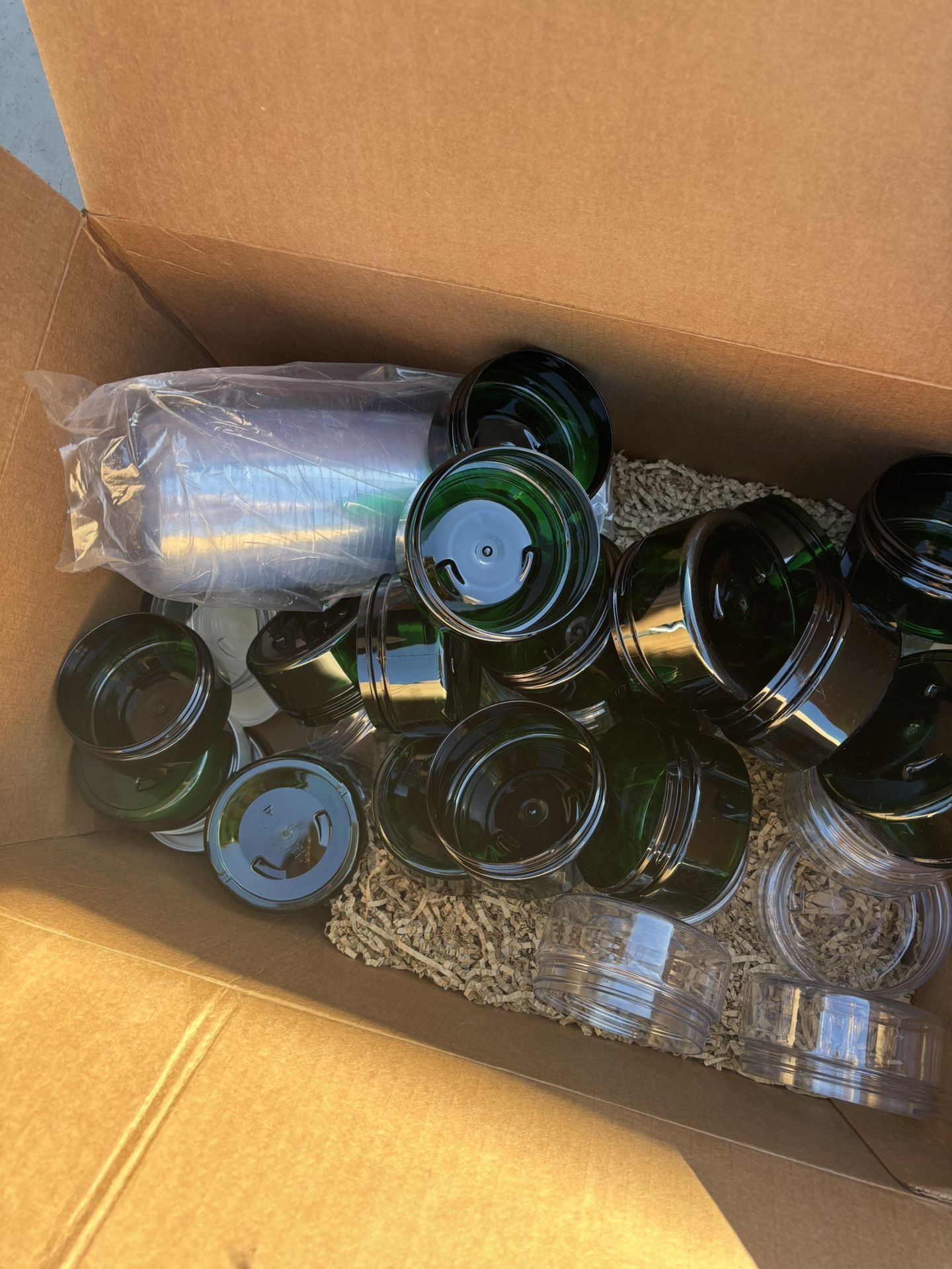 Green and clear BPA free plastic containers for body scrub, lotions, and anything your heart desires! Everything pictured is included- all lids, containers, and plastic wrap (to prevent spills during shipping)