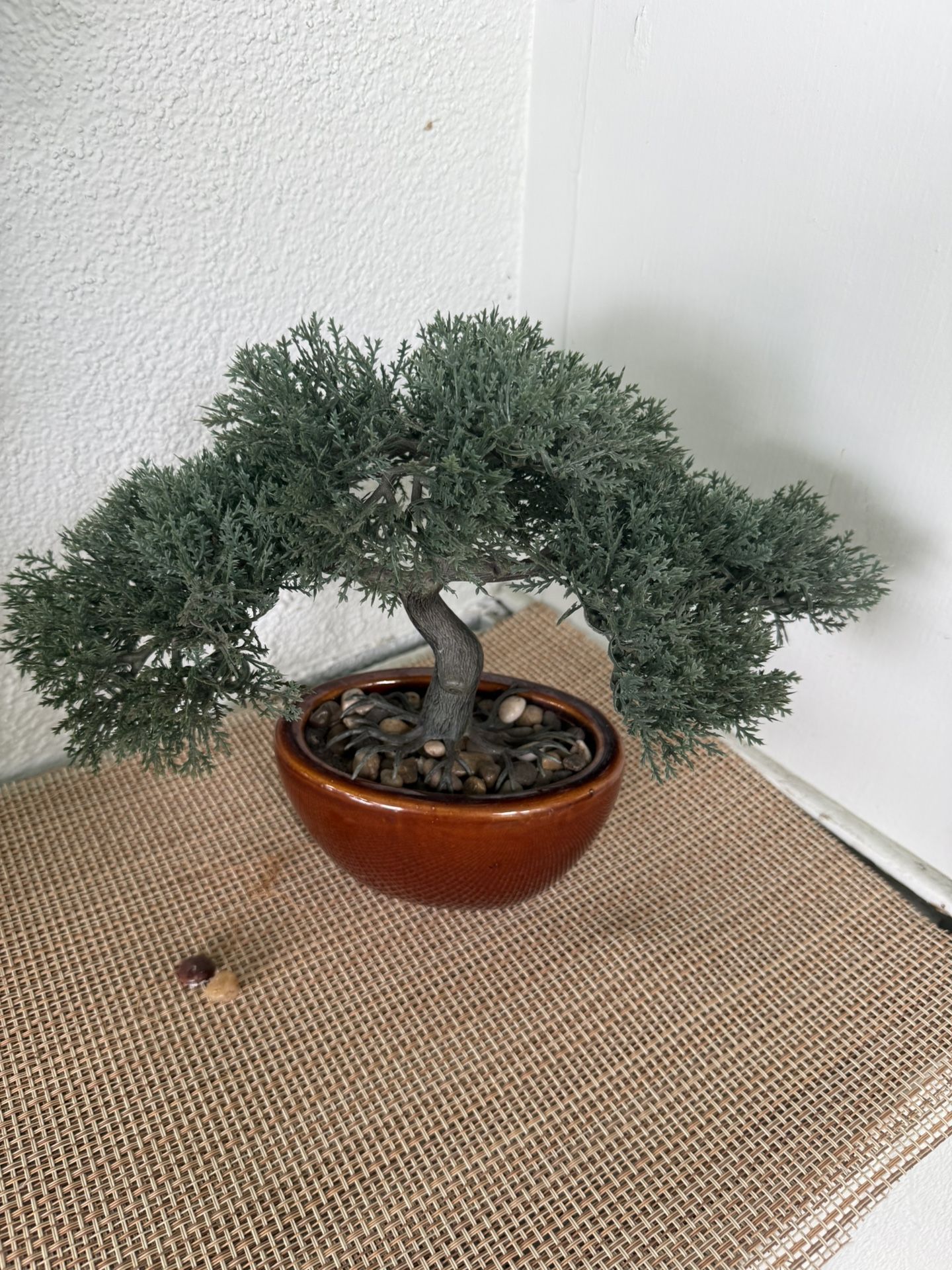 10x15 Artificial juniper bonsai tree in decorative pot, resembling a living plant.