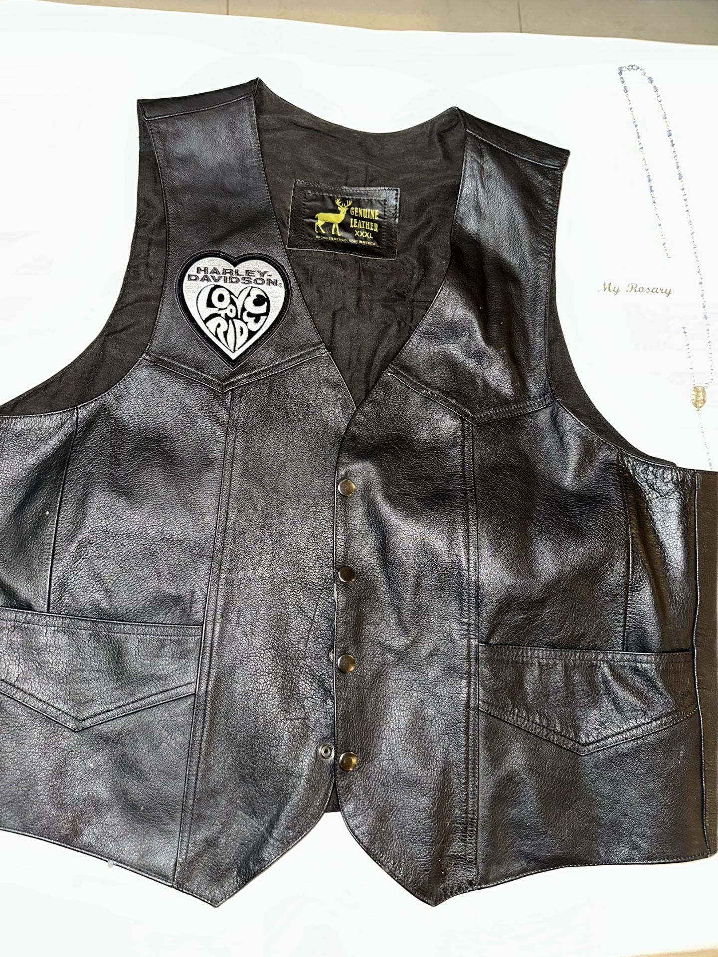 This is a vintage Harley Davidson motorcycle vest for men in size 48. Made of black leather with a biker-style design, it features logo accents and patches. The vest has a snap closure, lined interior, and pockets for practicality. It is part of the Harley Owners Group product line and is suitable for casual occasions, particularly for riding or racing activities. This biker vest embodies a classic motorcycle theme with a touch of nostalgia.