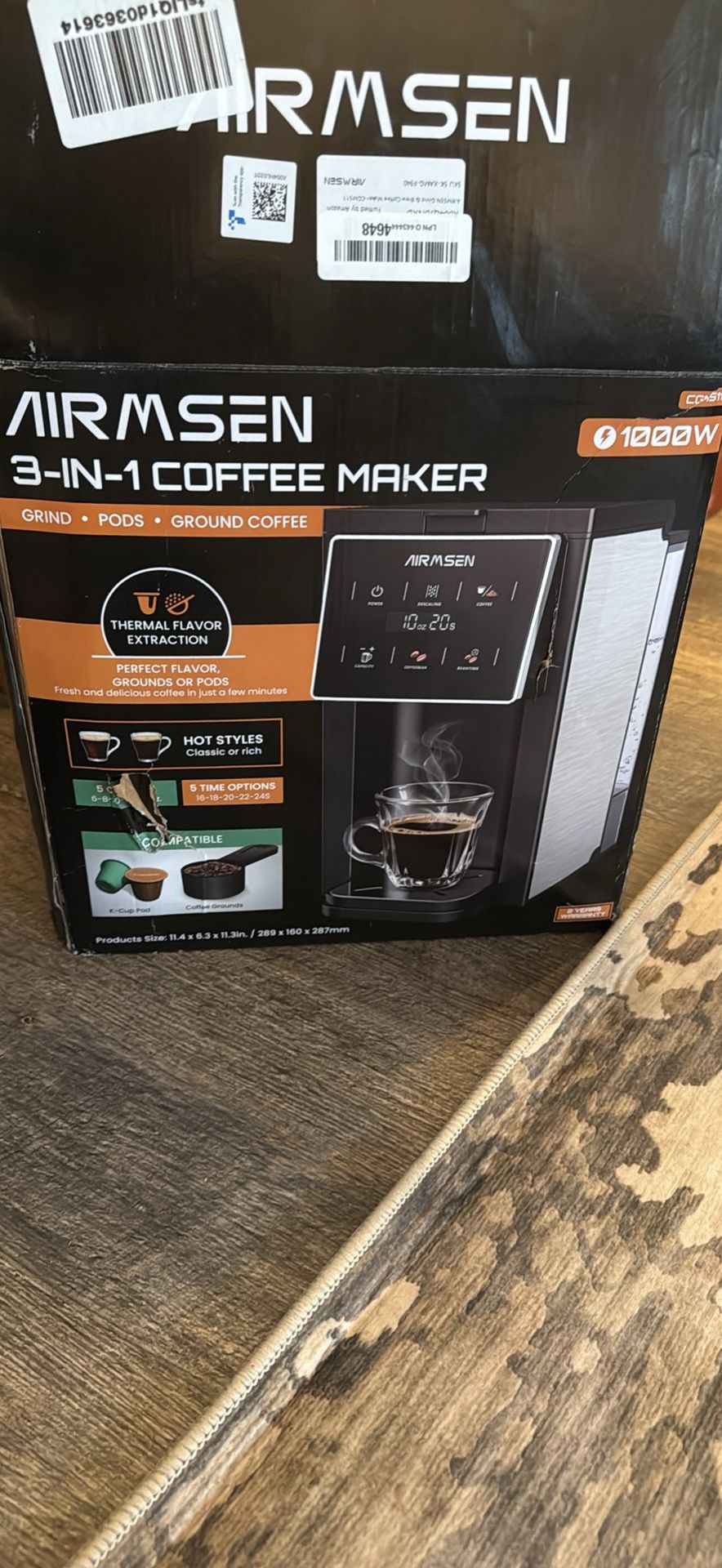Brand new AIRMSEN single-serve coffee maker. Works with K-cups, ground coffee, and reusable pods. Never used. Retails for $90–100.