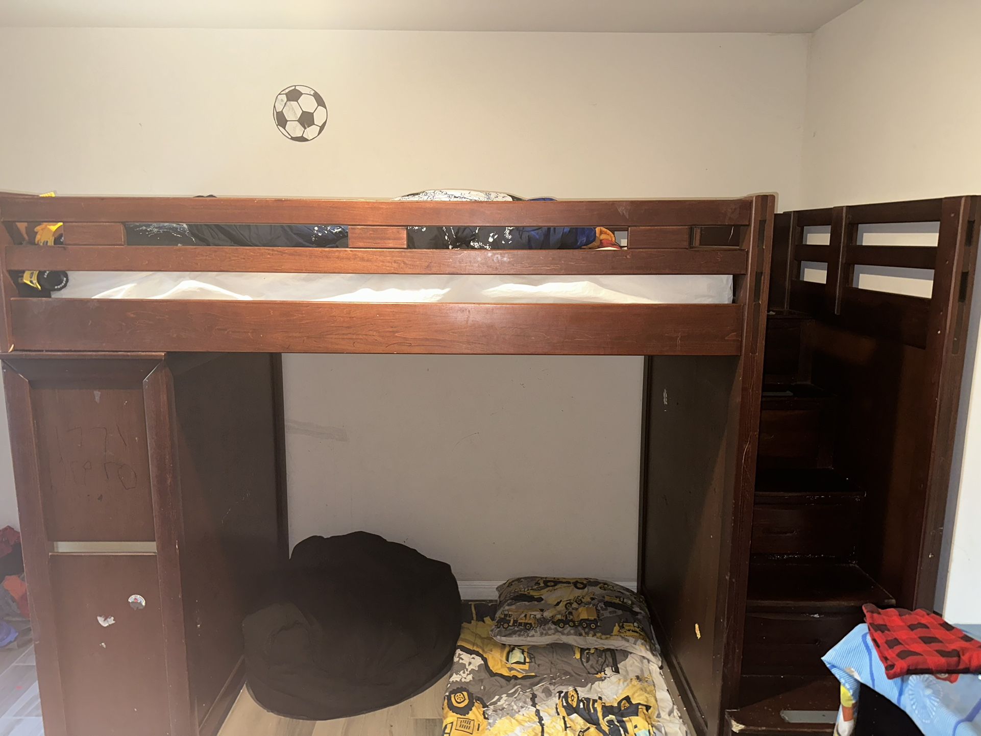 There is marker all over part of the bunk bed at the bottom and the drawers on the side need rescrewed. Just need it out of my house 50 $ OBO