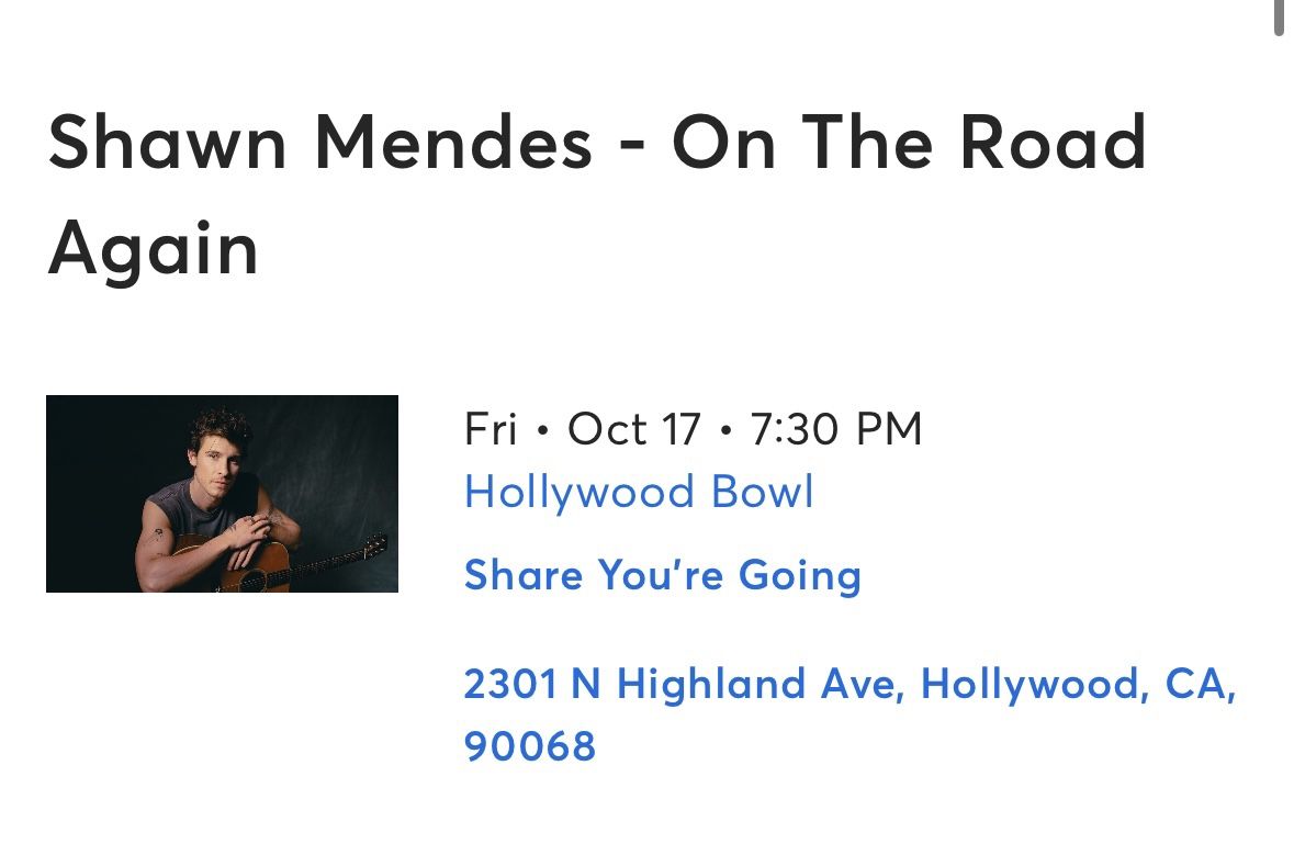 SHAWN MENDES - ON THE ROAD AGAIN FRIDAY • OCTOBER 17, 2025 • 7:30PM @ THE HOLLYWOOD BOWL SEATS: SEC L2, ROW 20, SEAT 117 & 118 The tickets are going for $140 each. $200 OR BEST OFFER TICKETS WILL BE SENT VIA TICKET MASTER I would like them gone, highest offer takes them.