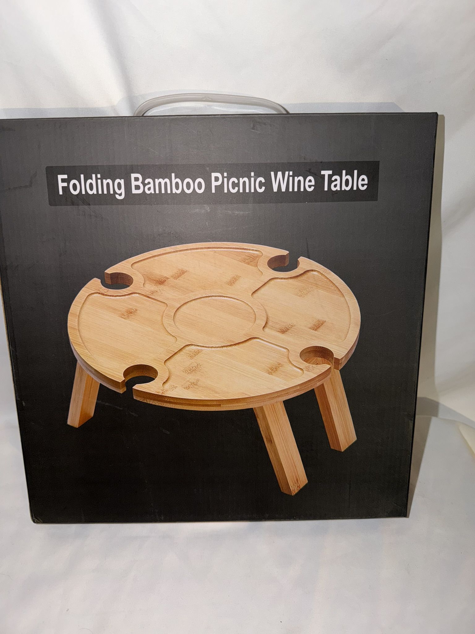 Brand new in box. Bamboo folding wine table, perfect for a picnic. Can hold 4 wine glasses. Compact, small, great for a nice day outside.