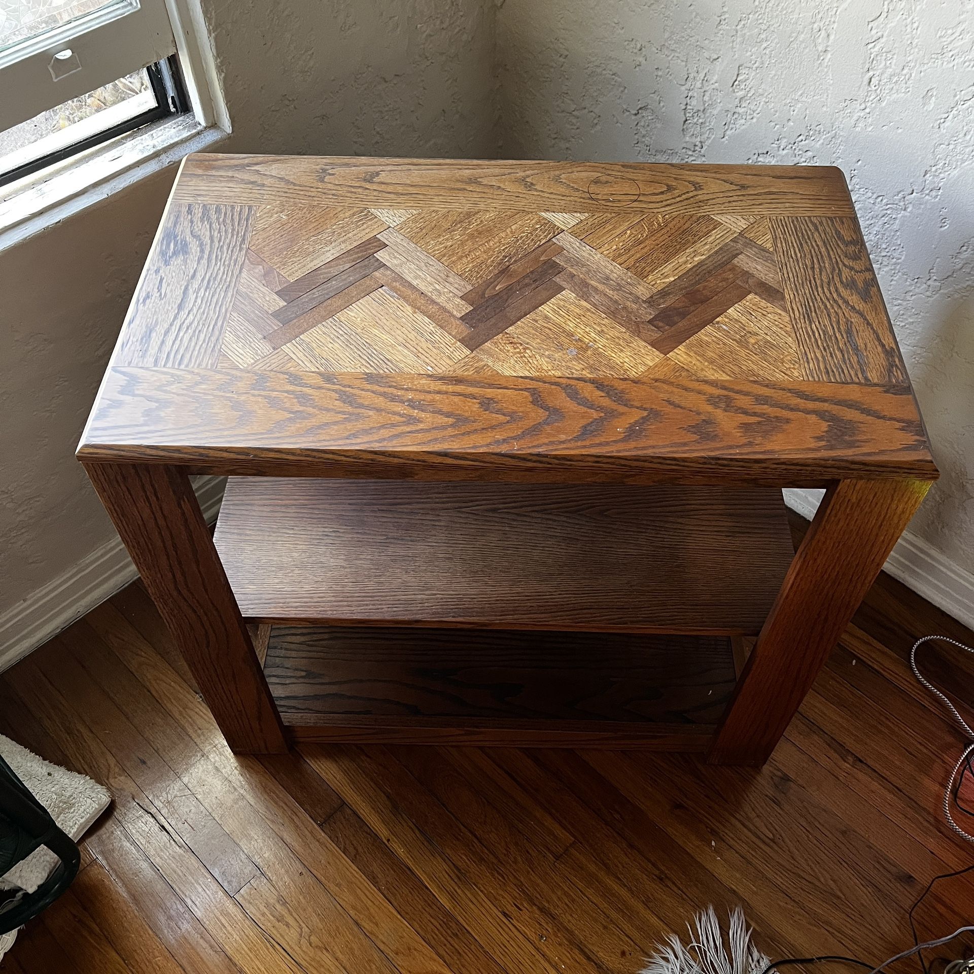This solid wood console table features a beautiful herringbone pattern on the top surface, showcasing the natural wood grain. The piece has a warm, rich tone that adds character to any space. Details: * Solid construction * Striking herringbone pattern on tabletop * Two spacious shelves for storage/display * Clean, modern lines with vintage charm * Excellent condition This versatile piece works beautifully as: * Console table in an entryway * Media stand * Bookshelf * Display piece for art objects * Side table in a living room