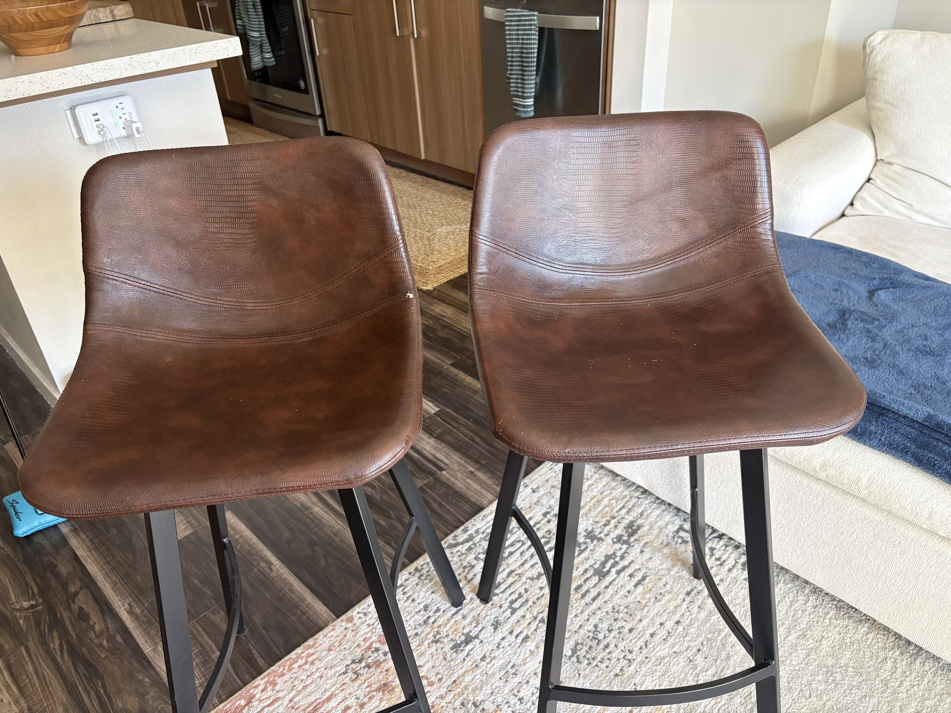 Pair of Brown Leather Barstools – Bar Height Selling a pair of brown leather barstools. They are bar height and very comfortable, perfect for a kitchen island or bar area. They have been gently used and are still in great shape, though there are some minor scratches on the leather from normal use. Selling as a pair only. Details: • Brown leather seats • Bar height • Very comfortable • Gently used with some light scratches • Sturdy and in good condition Pickup only