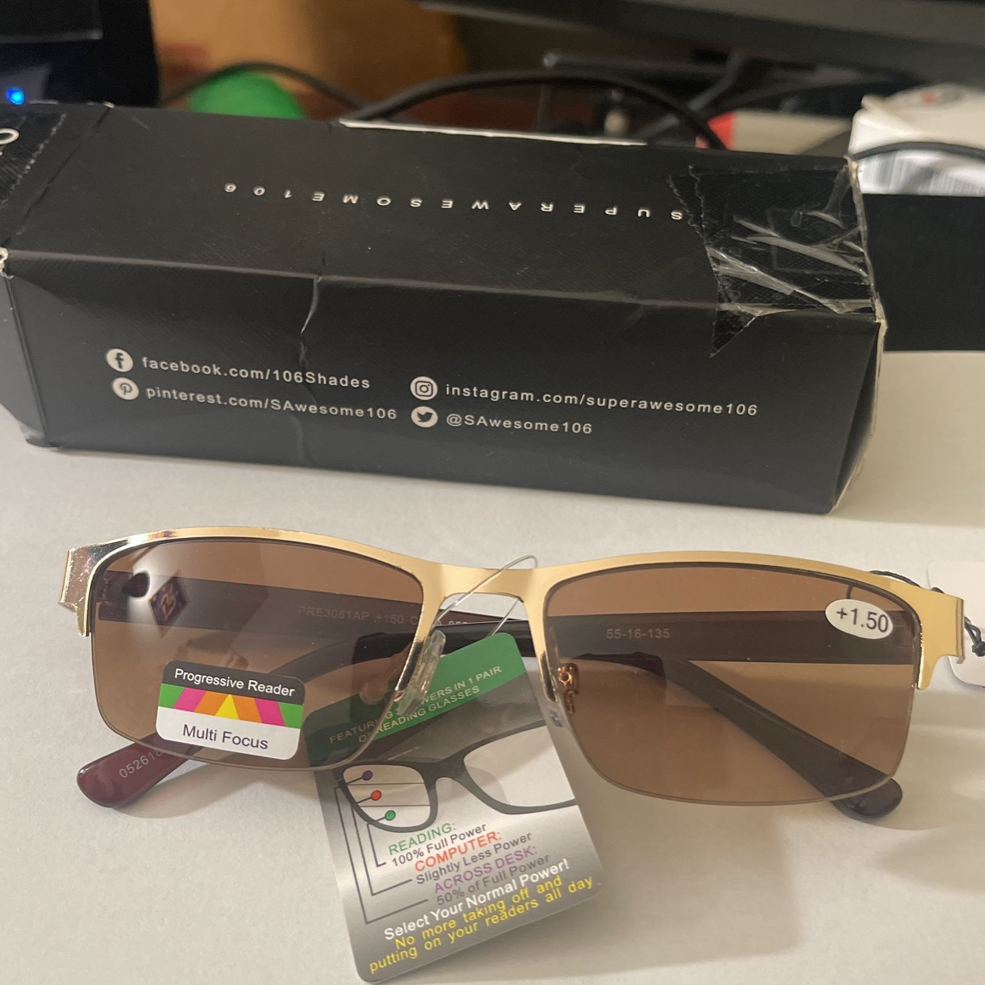 Sunglasses with progressive 1.5 power reading and distance vision glasses.