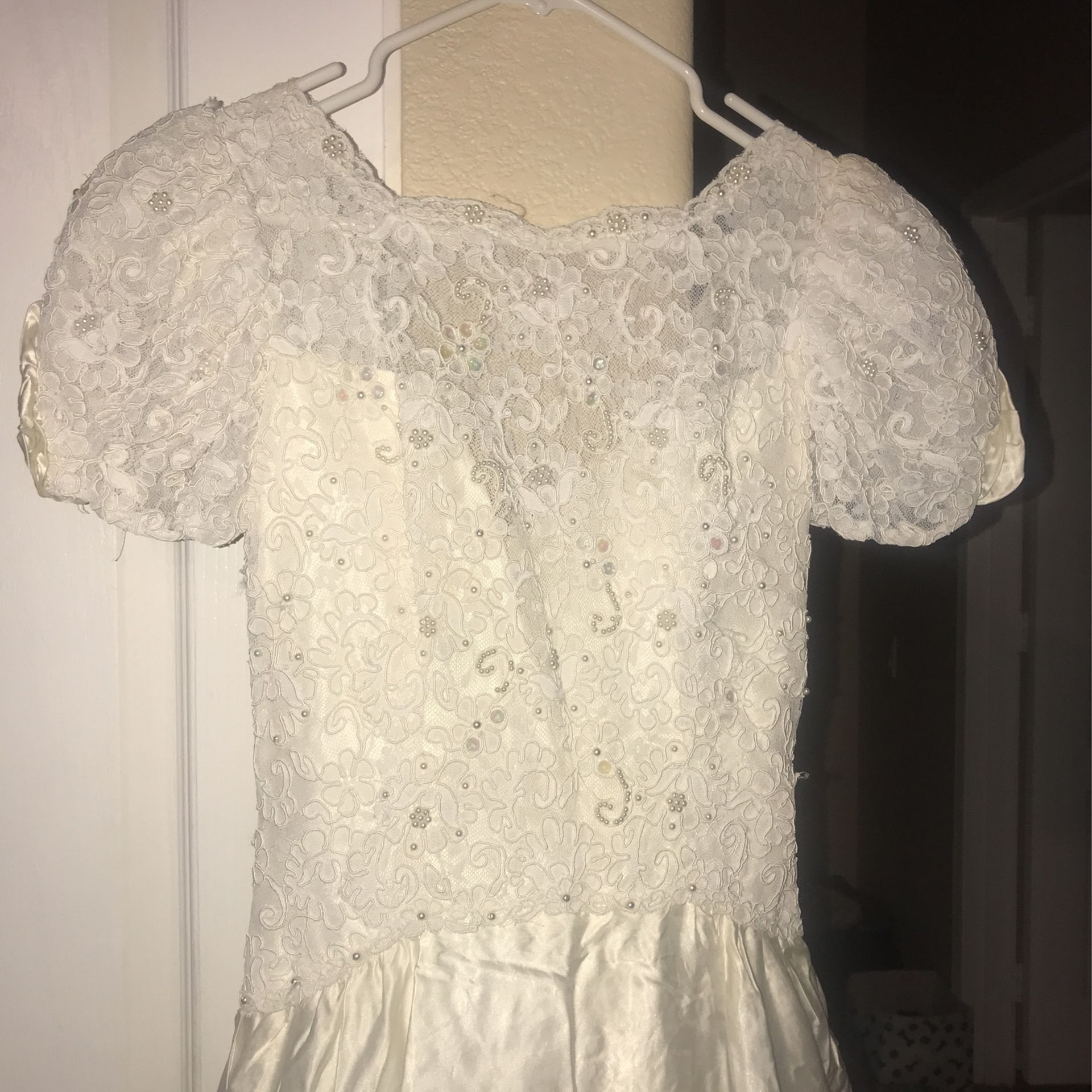 Old fashioned style wedding dress wore for beach wedding needs pressing has lace top with beading and slightly shorter in front off white color