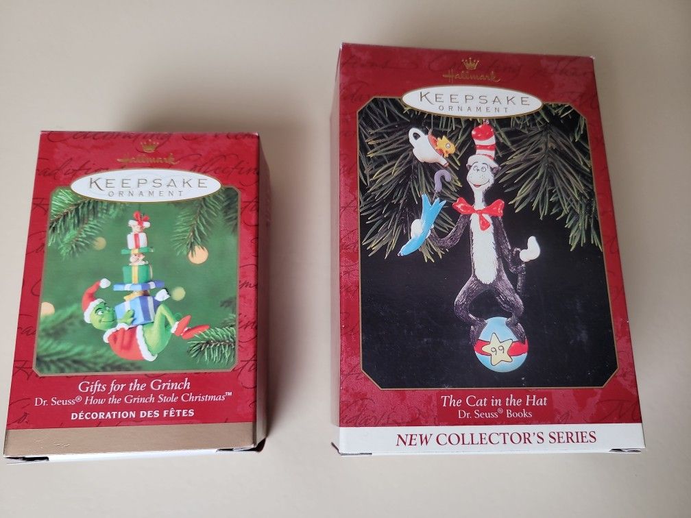 Hallmark Keepsake ornaments of Dr. Seuss characters. * The Grinch, sculpted by Kristina Kline (2000) [SOLD] * The Cat in the Hat, sculpted by Nello Williams (1999)