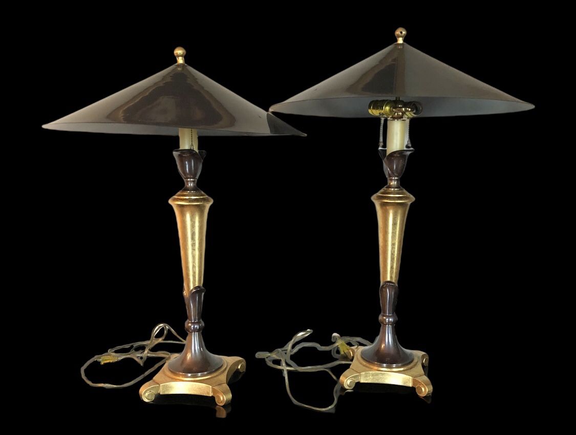 Frederick Cooper Chicago lamps, can be slightly adjusted for different heights. At their lowest height it’s 28.5” and its highest at 30.5”. Each lamp uses two bulbs. The metal dome like shades can be removed as well, they are 22” in diameter. Each lamp weighs around 15 pounds. Gold and brown in color.