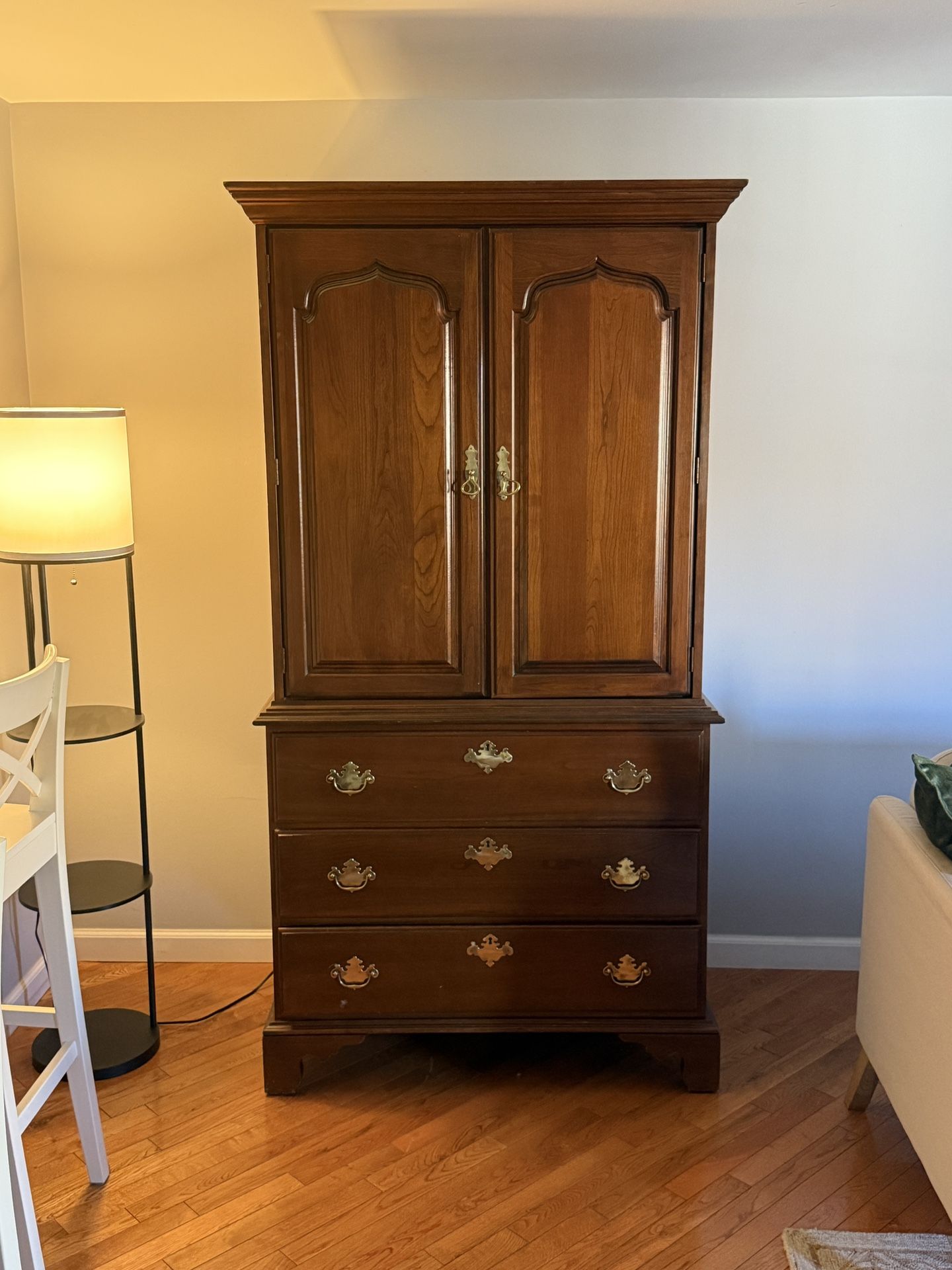 Available 2/8 from 22314. About 36” L x 22” W x 72” H. Beautiful piece!! No damage and in like new condition. Drawers and hardware all functional. We are moving and just can’t take it. Check out other listings for a bundle!