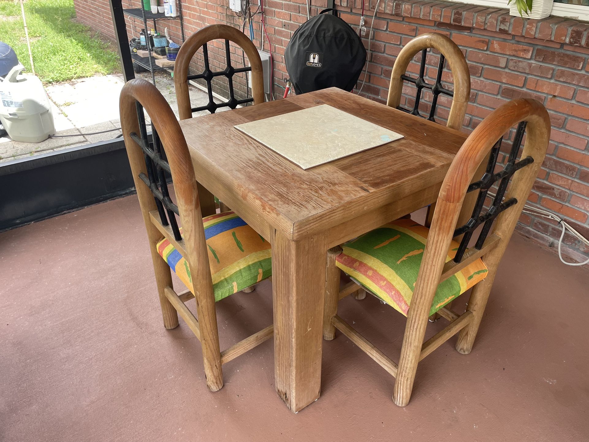 W 35” x 35” H 32” Made from solid Ponderosa pine (Needs work, great DIY project for resale). Includes four chairs with Hand-forged, wrought iron backing. No assembly required.